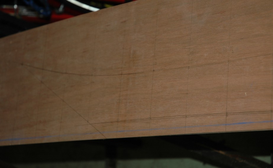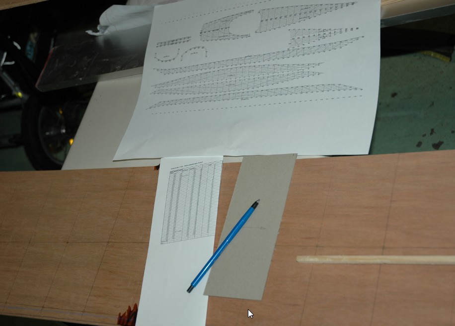 Mit einem Winkel und einem 8.5cm breiten Karton-Streifen habe ich die Spanten (0-45) auf den Platten angezeichnet. Danach habe ich mit den Angaben aus der Tabelle (Excel) je Spant die Kontur-Punkte markiert.