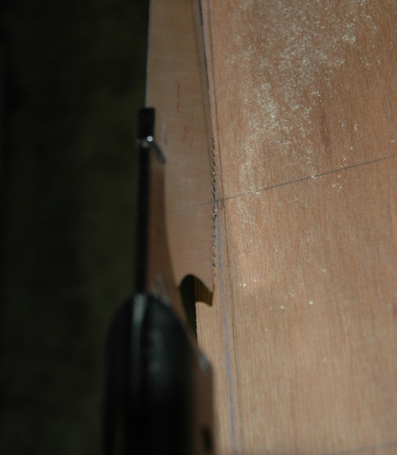 Entlang dieser Kurve (auf der Aussenseite) habe ich die Planken danach ausgesägt. Dabei habe ich eine Handsäge verwendet und 2-3mm Überstand gelassen, die ich mit dem Hobel und der Zieh-Klinge abnehmen werde. Die Japanischen Zug-Sägen sind aus meiner Sicht nicht langsamer oder unbequemer als eine Stichsäge und der Schnitt ist wesentlich sauberer und das Ganze viel leiser.