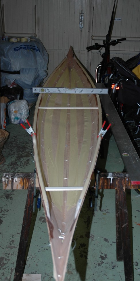 Nach dem Heften kommt das Ausrichten, damit das Kajak auch schön Gradeaus läuft. Ein Strich mit dem Laser von oben ergab, dass das Kajak faktisch grade ist. Also habe ich mir die Mallspanten erspart und lediglich eine Art “Wiege” aus Dachlatten auf den beiden Böcken festgeschraubt. Dort hinein habe ich das Kajak mittig gelegt und dann mit dem Laser und der Wasserwage geschaut, ob alles im Lot ist.