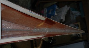 Nach dem alle Nähte ausgefüllt waren, habe ich den sogenannten End-Poor für den Bug gemacht. Dazu habe ich Sägespäne verwendet. Die Masse solle sehr zähflüssig sein.
