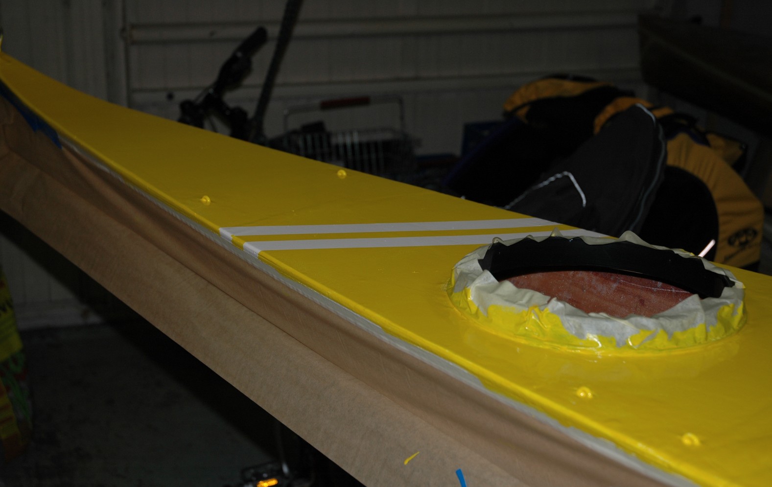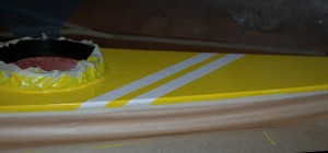 Vorn auf dem Deck sind ebenfalls 2 Streifen vorhanden. Die Kante vom Deck zum Rumpf werde ich mit schwarzem Tesa Gewebeklebeband abdecken. Meiner Erfahrung nach ist es für einen “Nicht-Lackier-Profi” ohne das weiche Maskierband kaum möglich, eine grade Lackkante hinzubekommen. Also werde ich die Lackkante lieber freiwillig unter dem Klebeband verstecken.