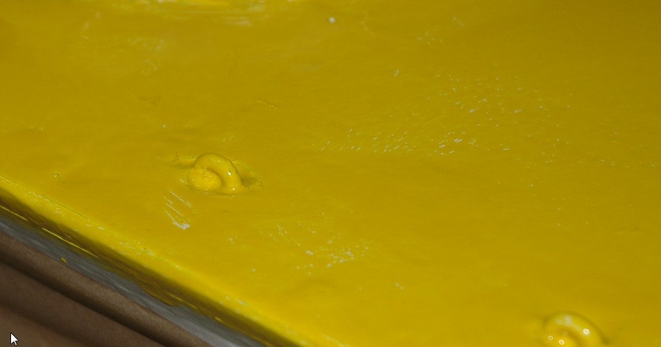 Der Acryllack ist auf der offensichtlich zu glatten Oberfläche zusammengelaufen und hat diese komischen Pünktchen “gezaubert”. Da muss ich nochmal schleifen. Die ganzen Ösen sind mittlerweile auch zugeschmiert und die muss ich ebenfalls noch freilegen. Aber das ist eines der ganz kleinen Prbleme.